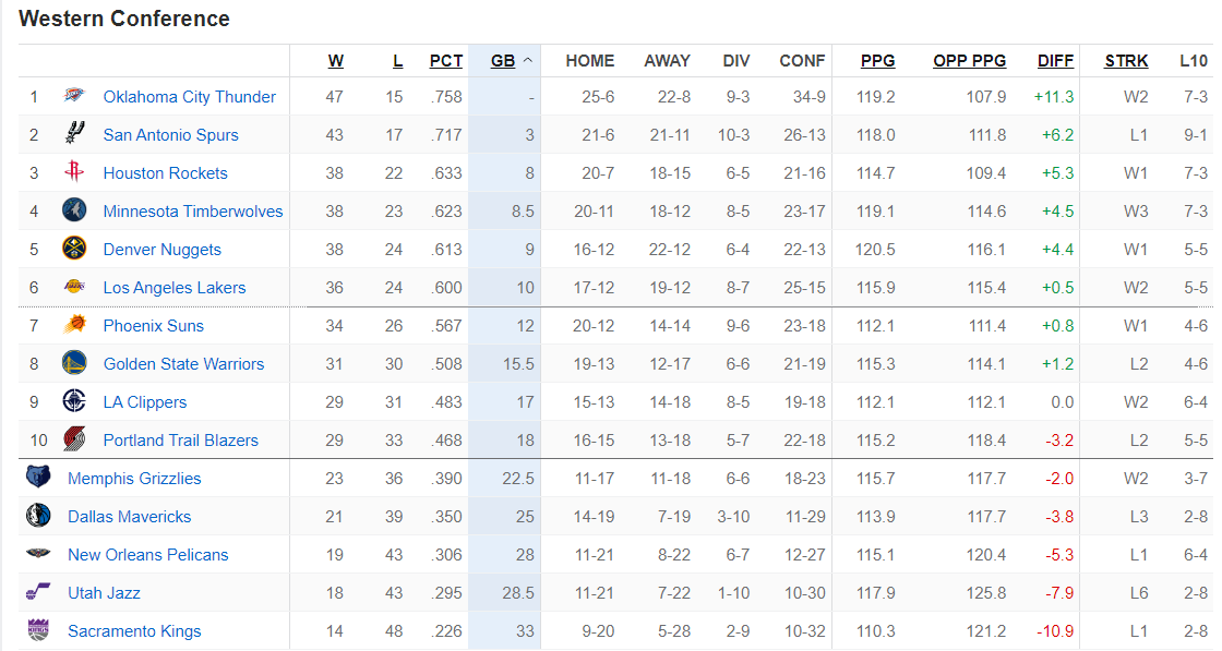 最新的西部排名:雷霆、马刺、火箭、森林狼、掘金、湖人、太阳、勇士、快船、开拓者、灰熊、独行侠、鹈鹕、爵士、国王。